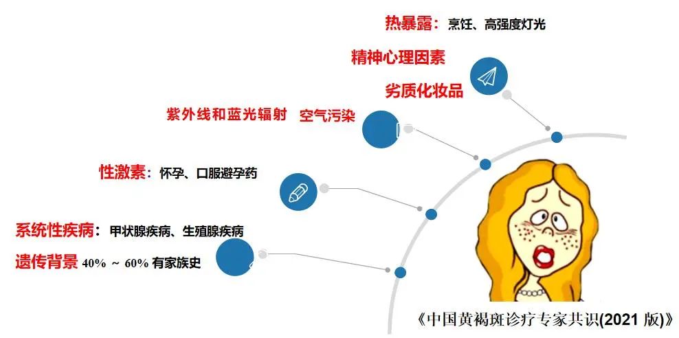 等因素有关;此外,日晒、不当的化妆品及皮肤清洁方式也会导致黄褐斑的产生。中医则认为,黄褐斑的发病常与肝、脾、肾功能失调有关,致使颜面部气血失和,气滞血瘀于面或气血亏虚,