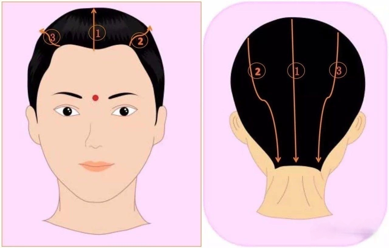 1、用梳子沿下图所示三条线梳头(或者用刮痧板刮头),每次5~10分钟即可。